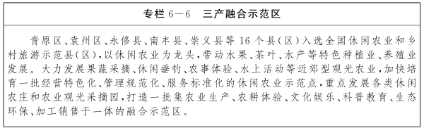 “五区示范”——发挥自身资源禀赋优势,以耕地为载体,积极探索三产融合发展新模式,并从农业产业延链增值、文旅结合、产业集群以及农业功能拓展等切入,重点建设赣北现代休闲农业示范区、赣北景观农业度假区、赣西绿色生态农业养生区、赣中乡村耕读文化探秘区、赣南客家民俗风情体验区等五个现代农业三产融合示范区。