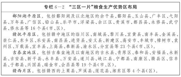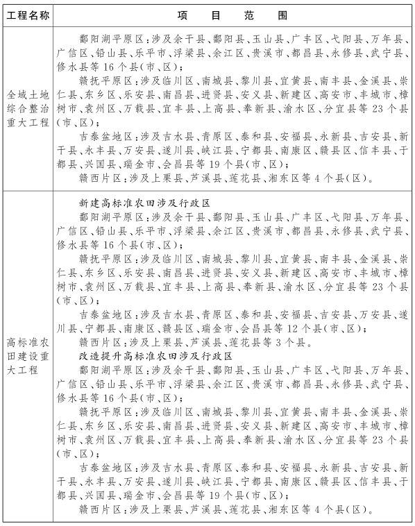 吉泰盆地区:涉及赣州市、吉安市。万亩样板区工程可实施范围涉及12个县(市、区),千亩样板区工程可实施范围涉及19个县(市、区)。