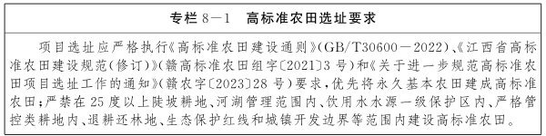 建设标准。根据江西省地理格局和资源禀赋特点,依据地形地貌、水网格局及永久基本农田相对集中连片、粮食生产优势区分布、高标准农田建设等因素,优先划定保护样板区。将土地集中连片较高、田块规则平整良好、水利设施配套完备及田间道路通达顺畅等有利于机械化耕作的地块统一纳入永久基本农田保护样板区,积极引导各区域永久基本农田建设和保护,实现永久基本农田标准化、基础工作规范化、保护责任社会化、监督管理信息化。