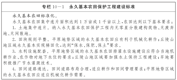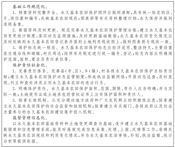 建设任务。规范和加强永久基本农田基础性工作,按地块完善永久基本农田基础数据和档案标识;利用现有江西国土调查成果应用平台和江西国土空间规划“一张图”实施监督信息系统,建立永久基本农田保护信息管理和动态监测系统。大力开展集中连片整治,统筹安排全域土地综合整治、高标准农田建设等项目,提高永久基本农田粮食生产能力。完善落实永久基本农田保护规章制度,研究建立永久基本农田保护的监管体系,严格落实各项永久基本农田保护措施。