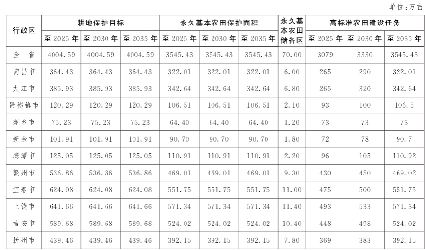 建设目标。充分考虑地域特点、永久基本农田集中连片分布情况、高标准农田建设、粮食生产功能区、经济社会因素等条件,在鄱阳湖平原区、赣抚平原区、吉泰盆地区、赣西片区等四大区域逐步开展永久基本农田保护工程。至2030年底,设立永久基本农田样板区100个,其中万亩样板区40个,千亩样板区60个。至2035年底,设立永久基本农田样板区500个,其中万亩样板区100个,千亩样板区400个;在样板区全面实现永久基本农田标准化、基础工作规范化、保护责任社会化、监督管理信息化,促进农业现代化发展。