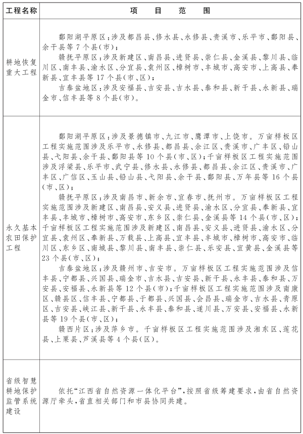 实施重点区域。重点在鄱阳湖平原区、赣抚平原区、吉泰盆地区恢复耕地潜力较大的县(市、区)实施,主要分布在9个设区市32个县(市、区),潜力面积约270万亩。具体县(市、区)为:渝水区、分宜县、袁州区、樟树市、丰城市、高安市、上高县、奉新县、宜丰县、都昌县、修水县、永修县、贵溪市、乐平市、鄱阳县、余干县、新建区、南昌县、进贤县、崇仁县、金溪县、黎川县、临川区、南丰县、安福县、吉安县、吉水县、泰和县、新干县、永新县、瑞金市、信丰县。