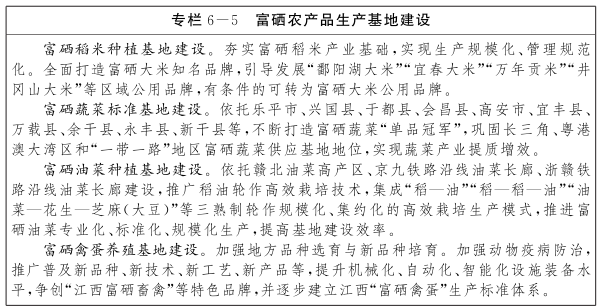 拓宽富硒农业特色空间。依托全省丰富的富硒土壤资源分布,拓宽富硒农业特色空间,因地制宜培育发展一批区域特色名优农产品品牌。重点发展富硒稻米、蔬菜、油菜、禽蛋等优势产业,鼓励各地因地制宜发展特色富硒产业,建设一批现代化、规模化、专业化、标准化富硒种养生产基地。