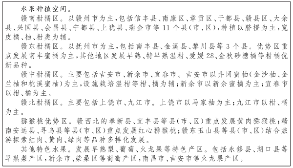 ——水果种植空间。做大做强以“脐橙、蜜桔、甜柚”等为主的柑橘优势产区,加强脐橙复产、南丰蜜桔品种改良和核心产区建设,加快马家柚、井冈蜜柚等甜柚产区建设。同时,加快发展猕猴桃、早熟梨、葡萄等特色水果产区,着力培育蓝莓、火龙果等新型特色水果基地,促进全省果业均衡发展。重点打造赣南脐橙、南丰蜜桔、井冈蜜柚、马家柚、奉新猕猴桃等一批绿色果业品牌。到2025年,全省水果总产量450万吨左右,其中柑橘园年产量400万吨左右。