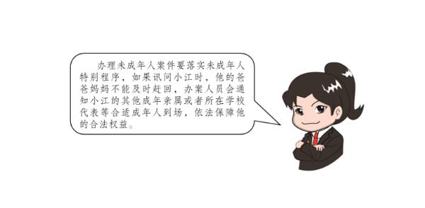 《未成年人保护法》第一百一十条规定:公安机关、人民检察院、人民法院讯问未成年犯罪嫌疑人、被告人,询问未成年被害人、证人,应当依法通知其法定代理人或者其成年亲属、所在学校的代表等合适成年人到场,并采取适当方式,在适当场所进行,保障未成年人的名誉权、隐私权和其他合法权益。