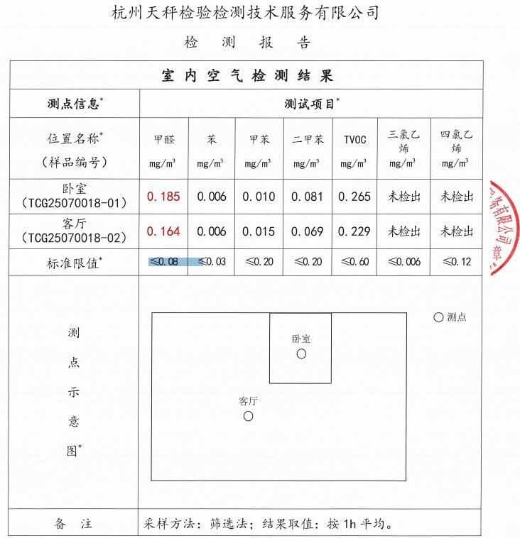 7月2日,马先生请专业甲醛CMA检测机构对自己所租的房子卧室和客厅两个点进行检测,结果显示甲醛超过国家标准。在一份由杭州天秤检验检测技术服务有限公司出具的检测报告中,记者看到,该司对卧室与客厅进行室内空气检测结果分别为甲醛0.185 mg/m³,甲醛0.164 mg/m³,而其给出的标准限值则是≤0.08 mg/m³。