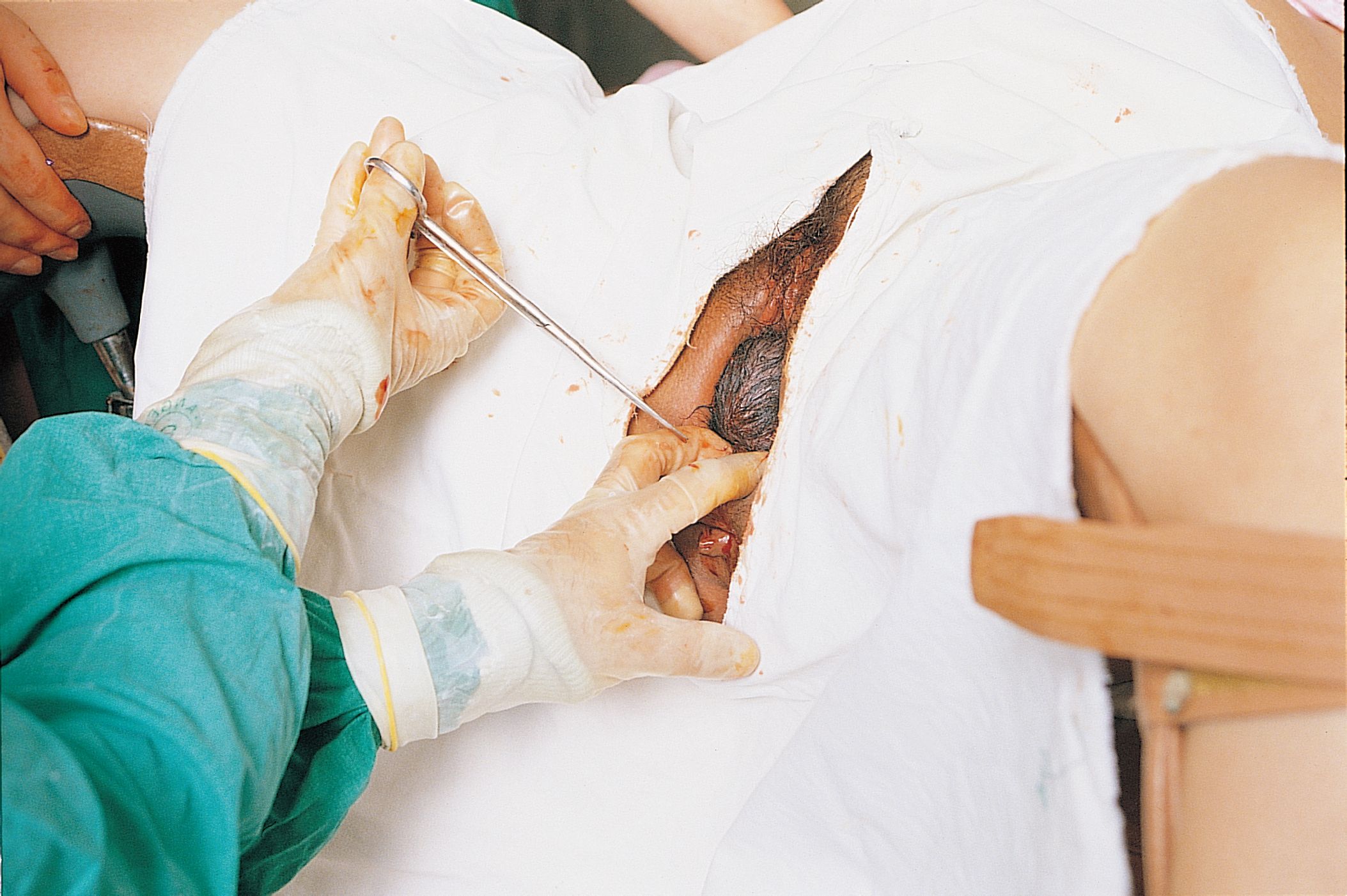 分娩时,孩子的头压迫着会阴无法出来。这时要用剪刀剪开会阴,方便孩子娩出。