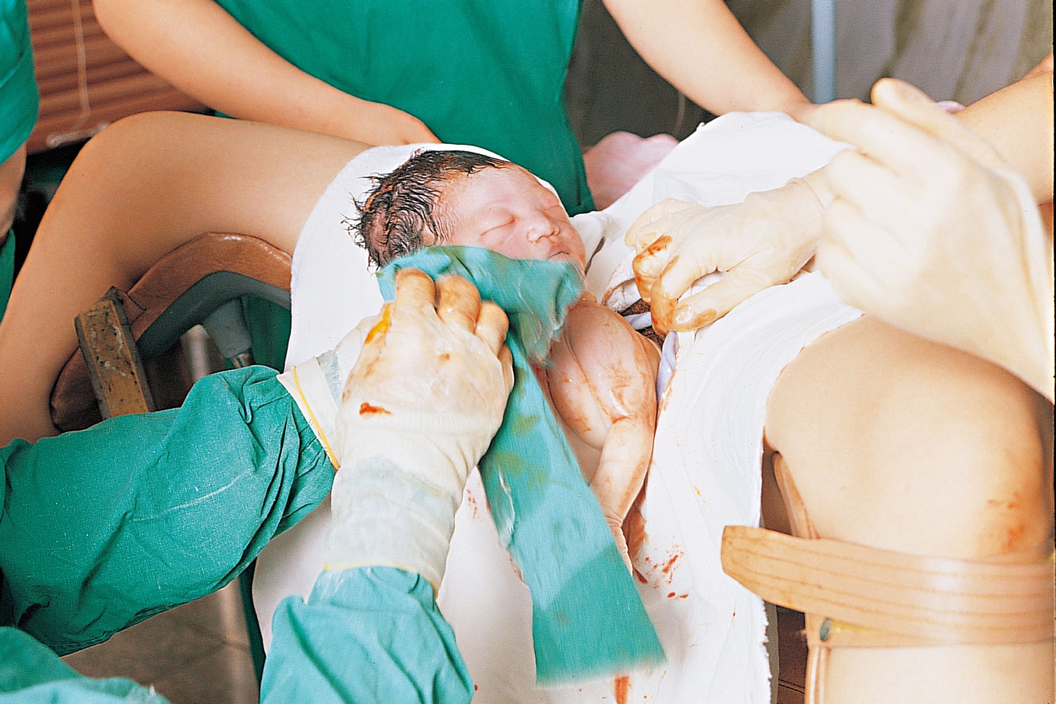 清除了羊水和异物后,要剪断孩子的脐带。这个瞬间意味着孩子从妈妈身体里独立出来了。在产妇流出胎盘期间,医生会帮助孩子疏通呼吸道,让孩子可以自主呼吸。孩子发出了第一声啼哭。