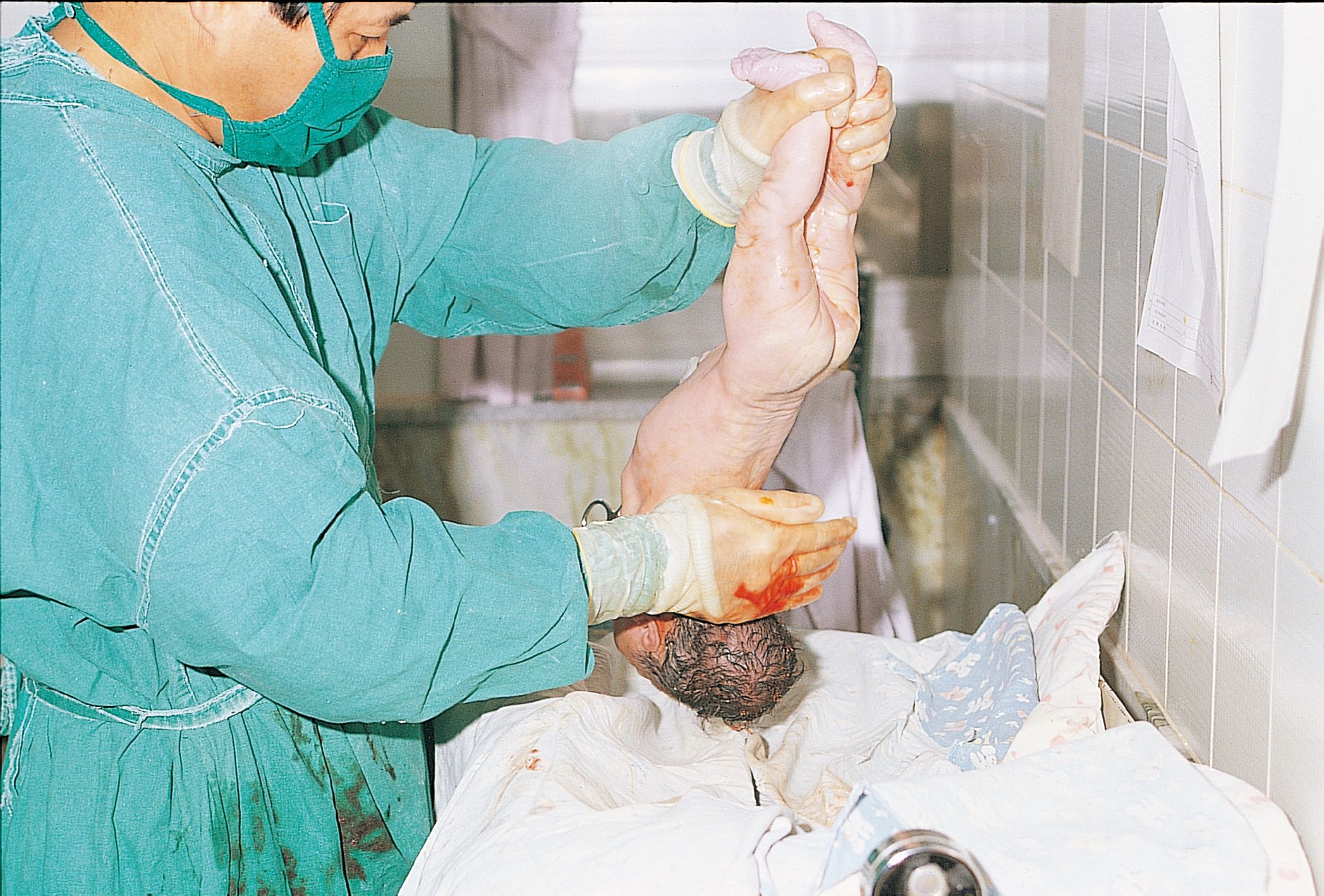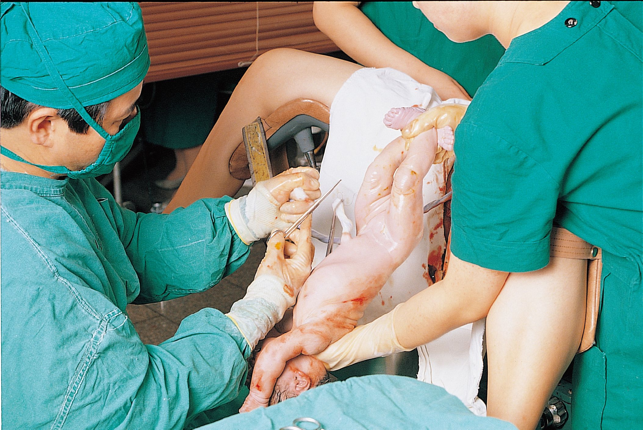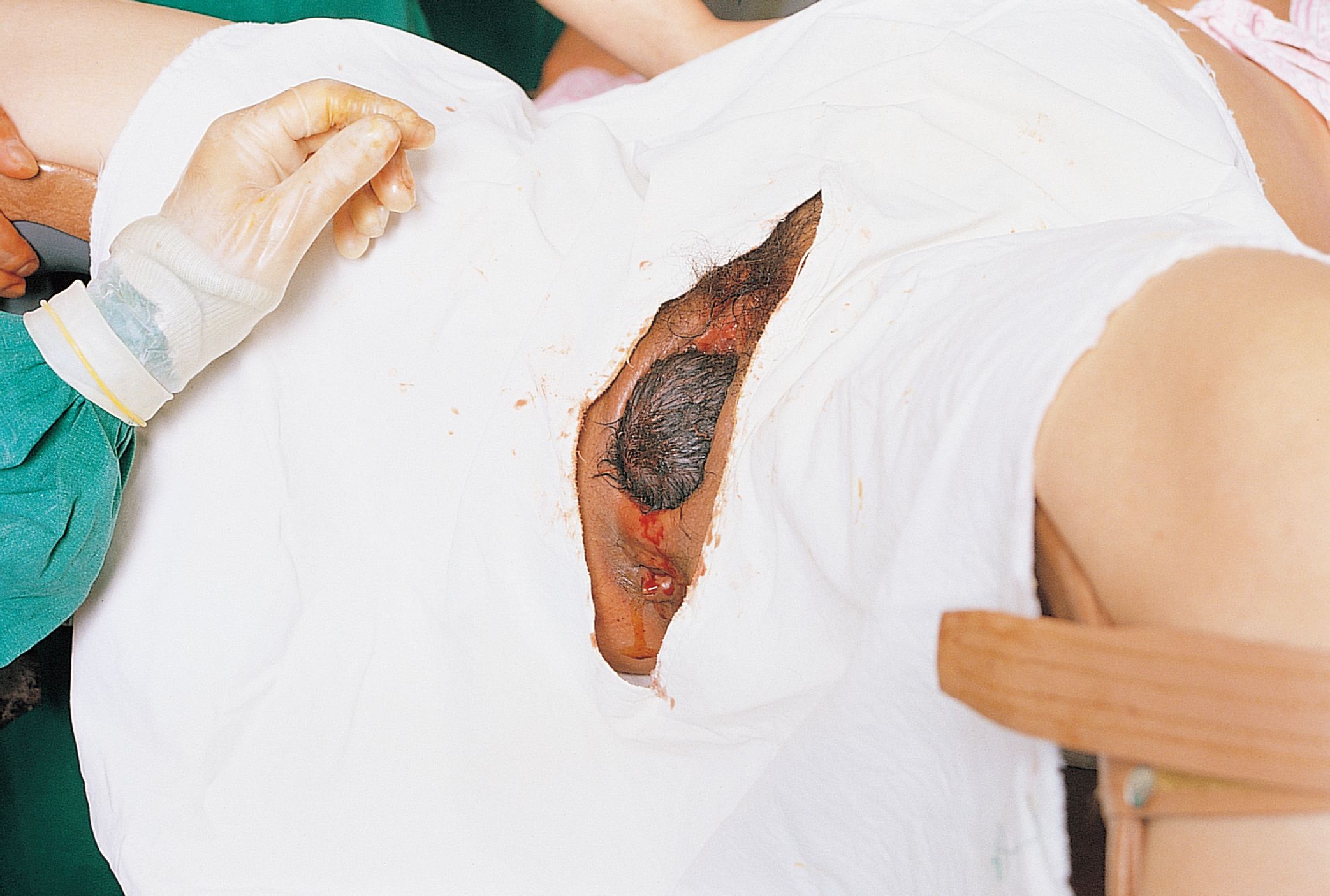 上产床后,导尿(把尿排净,空出膀胱),剃掉阴毛。准备结束后,孕妇要像之前练习过的那样,开始用力。最先露出来的是孩子的头部。