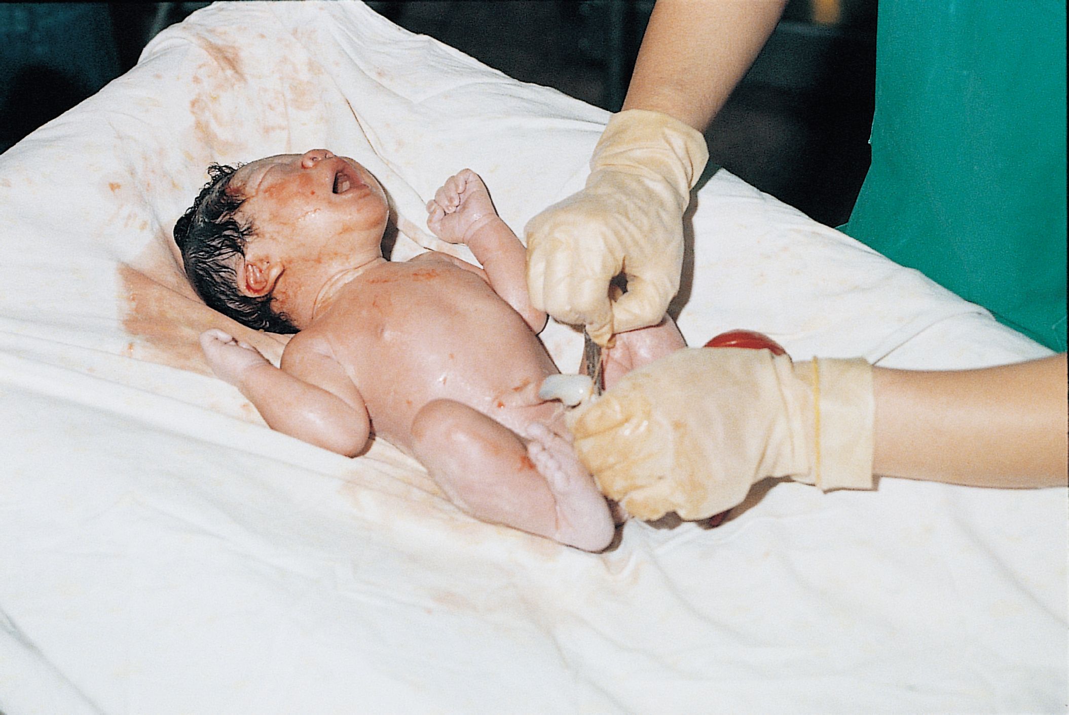 伴随着哭声,孩子开始了呼吸(肺部呼吸),这时要再一次将鼻子里和嘴里的异物清除干净。