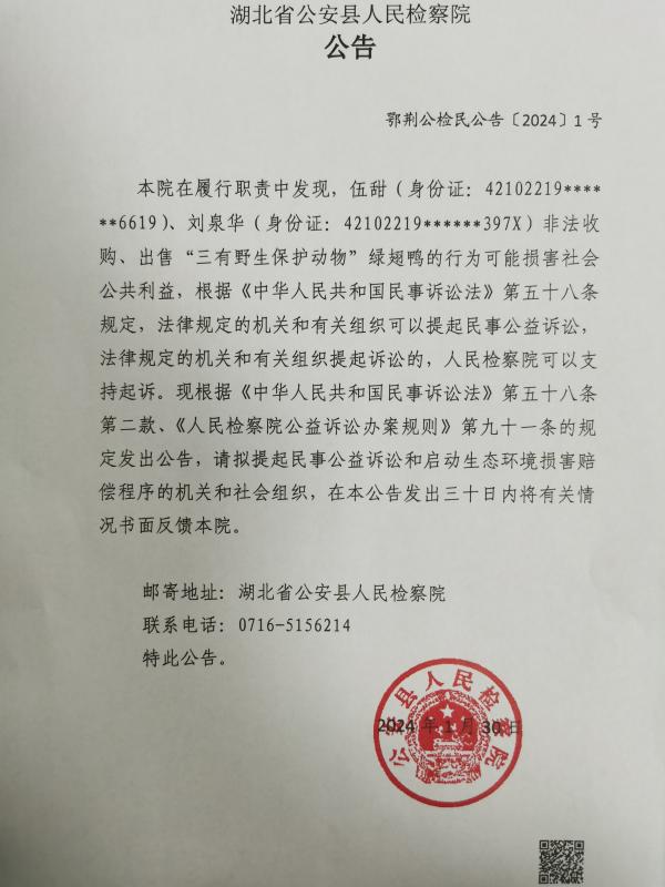 本院在履行职责中发现,伍甜(身份证:42102219******6619)、刘泉华(身份证:42102219******397X)非法收购、出售“三有野生保护动物”绿翅鸭的行为可能损害社会公共利益,根据《中华人民共和国民事诉讼法》第五十八条规定,法律规定的机关和有关组织可以提起民事公益诉讼,法律规定的机关和有关组织提起诉讼的,人民检察院可以支持起诉。现根据《中华人民共和国民事诉讼法》第五十八条第二款、《人民检察院公益诉讼办案规则》第九十一条的规定发出公告,请拟提起民事公益诉讼和启动生态环境损害赔偿程序的机关和社会组织,在本公告发出三十日内将有关情况书面反馈本院。