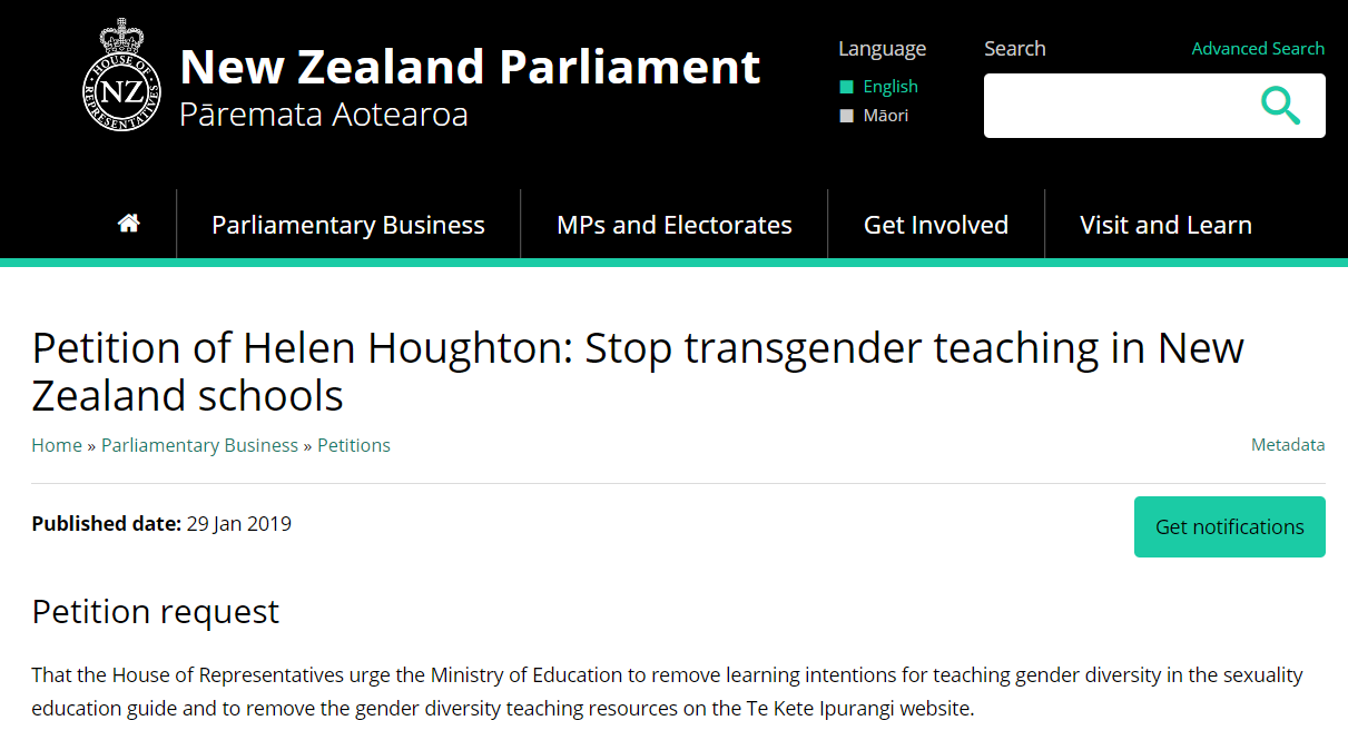 请愿书要求新西兰众议院敦促教育部删除性教育中关于多元性别的教育,并阐述原因:“我相信教师已经被要求为所有学生营造一个安全的环境,不论他们是什么种族、宗教、语言、残障与否、性取向。课程大纲没有要求教师专门教授有关少数族裔的内容,所以为什么要专门教授性别多元?我认为通过公共教育与法律政策把性别不一致视为正常、予以支持,会让儿童和家长感到困惑。”新西兰议会网站显示,请愿书发布于2019年1月29日,3月28日截止,截止目前(3月3日),已有36881人联署。