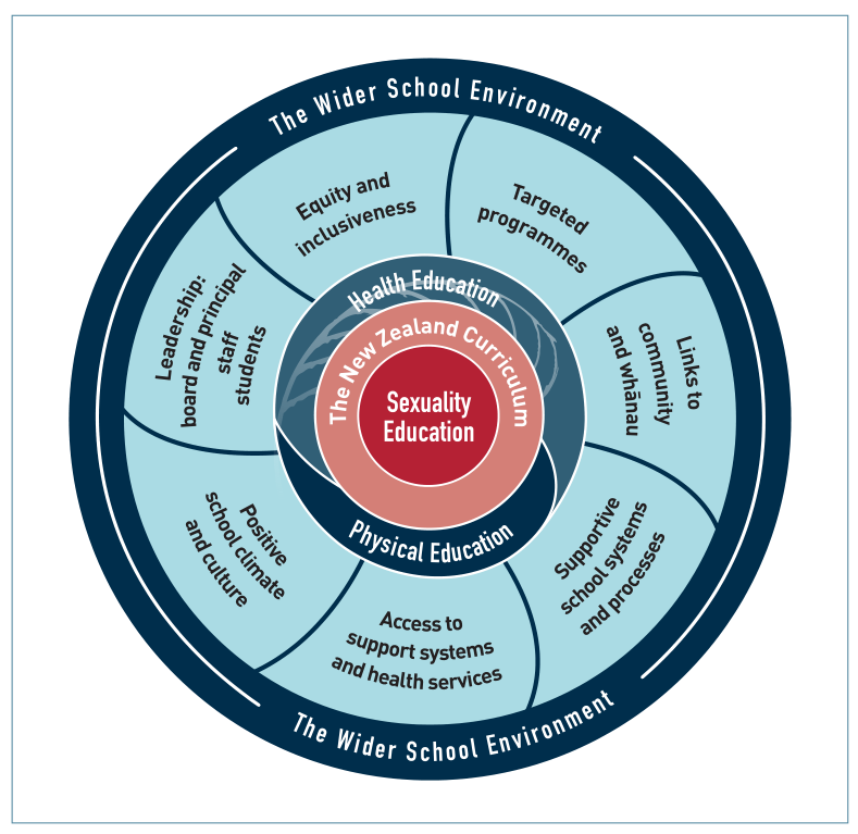 在《新西兰国家课程标准》中,性教育是“健康与身体教育”的一部分。性教育不只是与性行为和生殖相关的教育,还涵盖了生理知识之外更广泛的方面,这可以从“性教育”的用词体现出来。《性教育指南》中,“性教育”的用词是sexuality education,而不是表意局限的sex education,Sexuality包含了性的生理、社会、心理、情感、精神等不同面向。