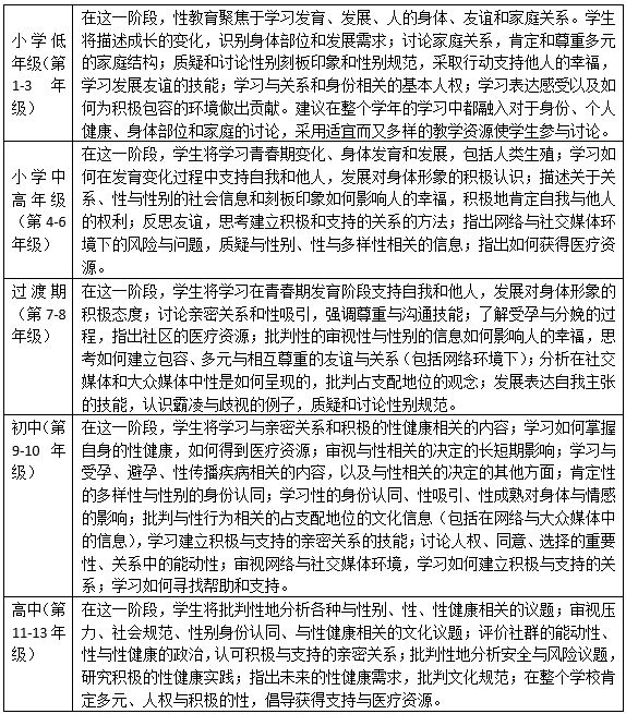 《性教育指南》在正文第一章阐述了性教育的内容与重要性:“在性教育中,青少年学习与自身相关的知识,学习知识和技能帮助他们以积极、尊重、支持的方式与他人互动。通过性教育,学生也会理解社会与文化的影响如何形塑社会看待性与性别的方式。”(p.4)“所有青少年都需要获得信息和机会去思考、质疑与讨论如下议题:关系、社会性别、性的身份认同、性倾向、性行为、性与生殖健康、以及社会信息。性教育为这样的反思与讨论提供分析框架。性教育,作为健康教育的一部分,对于青少年的发展、学习与整体的幸福至关重要。对这一领域的学习有助于学生学业的成功,促进学生在心理、情感、身体与精神等方面的积极、健康。”(p.4)