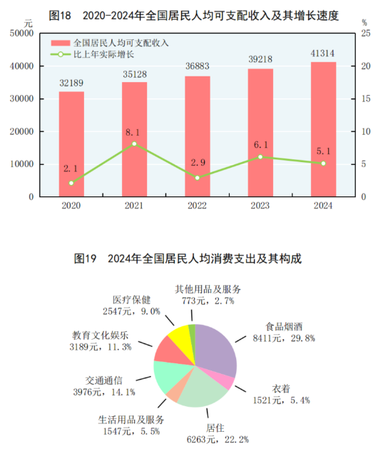 全年全国居民人均可支配收入41314元,比上年增长5.3%,扣除价格因素,实际增长5.1%。全国居民人均可支配收入中位数[61]34707元,增长5.1%。按常住地分,城镇居民人均可支配收入54188元,比上年增长4.6%,扣除价格因素,实际增长4.4%。城镇居民人均可支配收入中位数49302元,增长4.6%。农村居民人均可支配收入23119元,比上年增长6.6%,扣除价格因素,实际增长6.3%。农村居民人均可支配收入中位数19605元,增长4.6%。城乡居民人均可支配收入比值为2.34,比上年缩小0.05。按全国居民五等份收入分组[62],低收入组人均可支配收入9542元,中间偏下收入组人均可支配收入21608元,中间收入组人均可支配收入33925元,中间偏上收入组人均可支配收入53359元,高收入组人均可支配收入98809元。全国农民工人均月收入4961元,比上年增长3.8%。脱贫县[63]农村居民人均可支配收入17522元,比上年增长6.9%,扣除价格因素,实际增长6.5%。