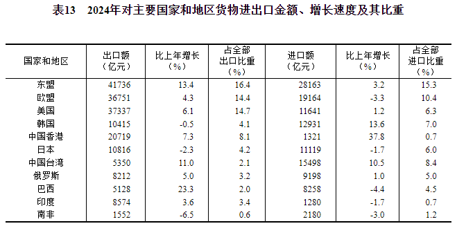 全年货物进出口总额438468亿元,比上年增长5.0%。其中,出口254545亿元,增长7.1%;进口183923亿元,增长2.3%。货物进出口顺差70623亿元。对共建“一带一路”[50]国家进出口额220685亿元,比上年增长6.4%。其中,出口122095亿元,增长9.6%;进口98589亿元,增长2.7%。对《区域全面经济伙伴关系协定》(RCEP)其他成员国[51]进出口额131645亿元,比上年增长4.5%。民营企业进出口额243329亿元,比上年增长8.8%,占进出口总额比重为55.5%;其中出口164717亿元,增长9.4%。