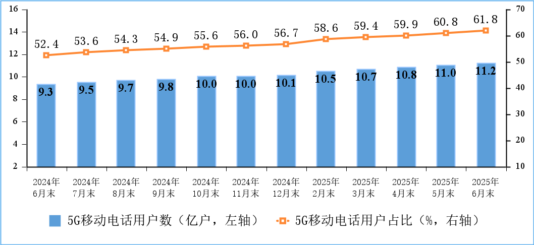 移动电话用户稳中有增,5G用户快速发展。截至6月末,三家基础电信企业及中国广电的移动电话用户总数达18.1亿户,比上年末净增1993万户。其中,5G移动电话用户达11.18亿户,比上年末净增1.04亿户,占移动电话用户的61.8%。