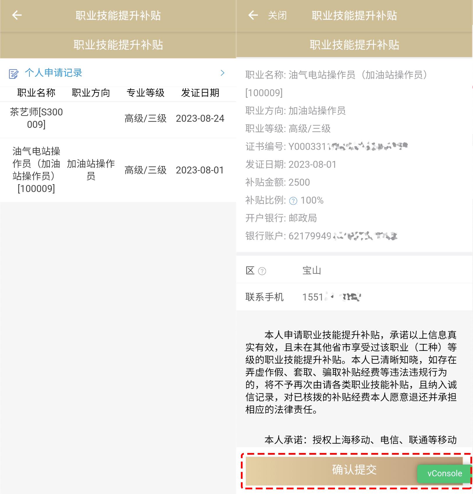 2、选择申请补贴的职业技能名称→确认个人信息和补贴信息后,点击“确认提交”