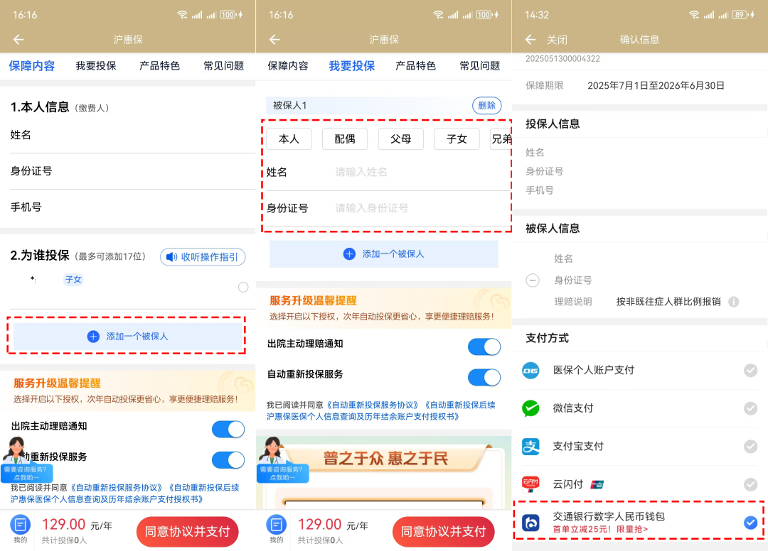 通过“随申办市民云”APP投保,使用交通银行数字人民币支付立减25元,优惠名额有限,先到先得!