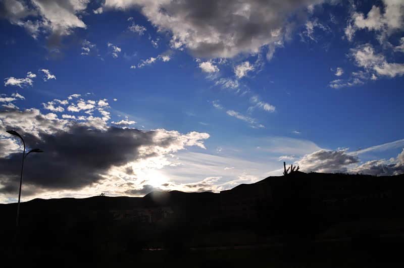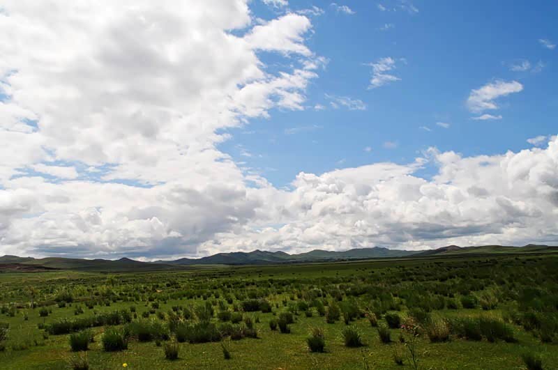 过了桑根达来就是浑善达克沙地,这是中国十大沙地,也是距离北京最近的一个,每年的沙尘暴多源于此地。我们沿着207国道便可以穿过沙地的东部,现在这里治沙卓有成效,沿路看不到成片的黄沙裸露,已被种上沙柳和一些不知名的灌木,而且禁止放牧,但愿在未来不远的时间里,这里可以重新恢复成绿草遍地的牧原。这时路上很少碰到车,天上一边夹着蓝天白云朗日晴空,另一边大片的乌云携着雷电滚滚而来,而我们行驶在中间,周围没有一辆车,似乎走进了一条时空隧道,妙不可言。