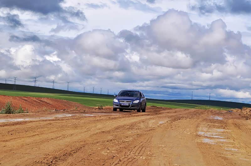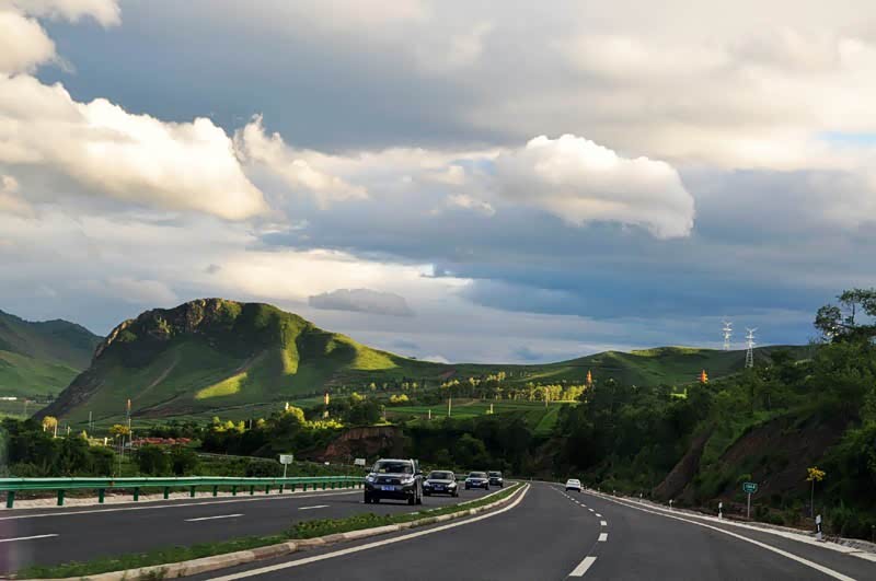 可惜的是307省道路况十分差,板油路被大车压的体无完肤,路上都是大大小小的坑,很颠簸。而且路上修路路段多,需要绕行土路、碎石路,很考验车的底盘和轮胎。旁边就是正在修的一条崭新的高速公路。一路上想找条路上新路,终于找到一条小路上了这条新铺的路向东行驶,路上跑了近1小时,一辆车都没有碰到,笔直的大路伸向望不到边际的天际,情不自禁的大唱着成龙的油菜花:一条大路呦,通呀通我家呀,我家就在呀南山下……,一路上的景色太美了,无以形容,果然是天堂草原。