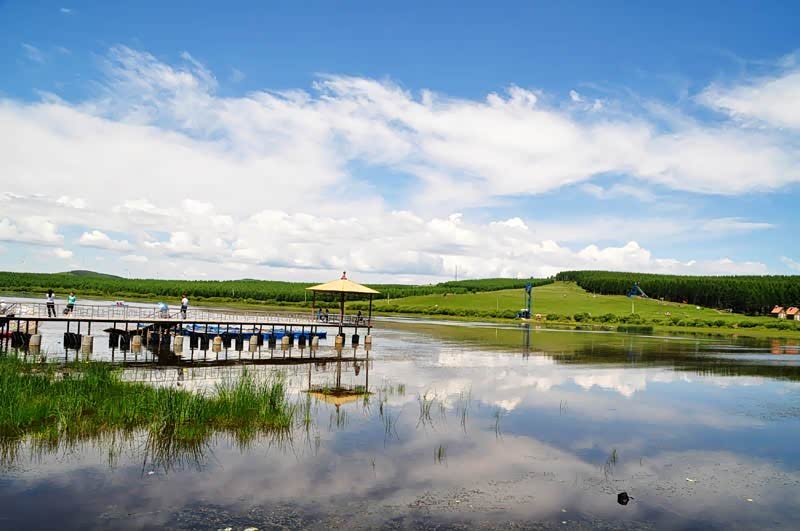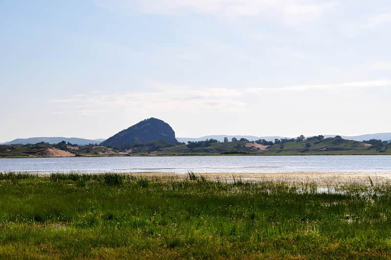 一觉醒来,已经是早上7:00,一看看日出已经是错过了,吃过早饭,出发去将军泡子,据说是个古战场,康熙和葛尔丹打仗的地方,到近前看,水面不大,秀美湖畔有绿色的开满小花的草地,水面后面一座馒头似的小山,北面远处小山上有成群的牛羊,成荫的树林。