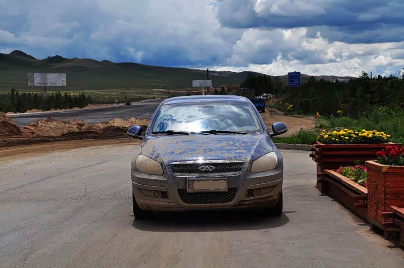 一路走走停停(下来照相)约30公里,到了一个正在修建的工地,前面的路还在修,又不知道如何回到老路上去,下车问了问,说前面工地里可以绕过去,一看只有越野车能过,怎么办?想回头又不知道要走多远,干脆想办法过去得了,工地上有的是砖头,一个字“垫”,呵呵,费了半天劲,终于垫出一条轿车能走的路,绕回了老路上,老天也来凑热闹,下起雨来了,老路又破又泥泞,一路上在泥汤中摸爬滚打,等到了西乌珠穆沁旗,乖乖,我们的车都变成泥车了,连本色都看不出来了,还好我们的车装了装甲底盘防护钢板,不是太大的托底都不怕,也抵上半个越野车了。一路上完全是自然的草原风光,除了蒙古包没有什么人造景观,无边无际(十分极目)。