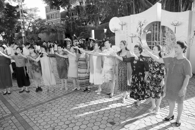联合国教科文组织总干事伊琳娜·博科娃(中)参与鼓浪屿居民的社区音乐活动。(资料图片)
