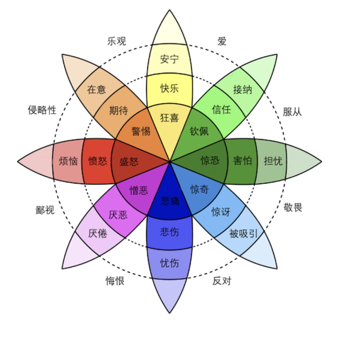 “情绪轮盘”(Plutchik, 1980),是心理学中很实用的区分情绪的工具。在轮盘中,Plutchik 区分了 8 类情绪,每种情绪都根据强烈程度的不同,给予了不同的命名。