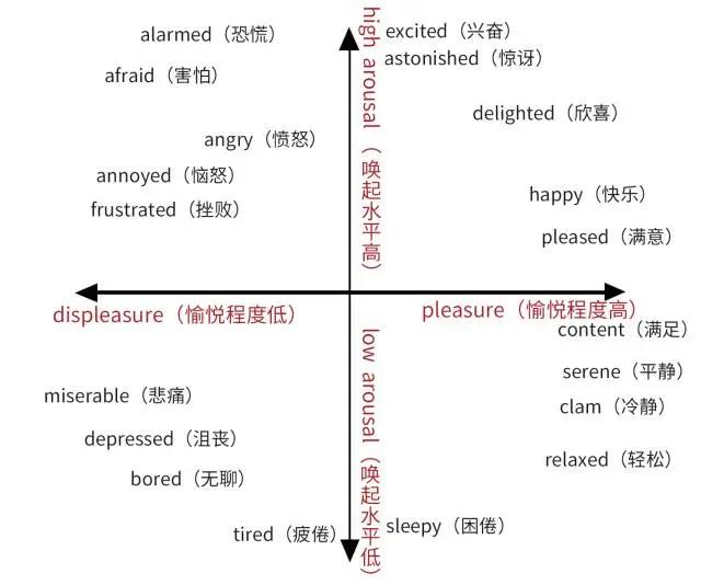 按照这两个维度,我们的一些基础情绪都能在坐标轴上找到自己的位置。比如,