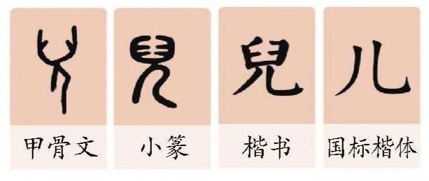 咱们先说“儿”。我们常用的“儿”是“兒”的简化字,往前追溯,其甲骨文字形是一个大脑袋、小身体的宝宝。我们知道,通常宝宝的脑袋特别大,腿却特别短,方便在妈妈肚子里蜷缩起来。细看发现,“兒”的甲骨文头上并不是个圆球,而是没有合缝,这一点我们就更佩服古人的观察力了:宝宝的头盖骨确实没有合缝,而是留着一块缝隙,这个缝隙叫“囟(xìn)门”,软软的。在后来的成长过程中,囟门才会慢慢合拢,形成完整的头盖骨。“儿”的本义就是小宝宝,后来特指男孩儿。