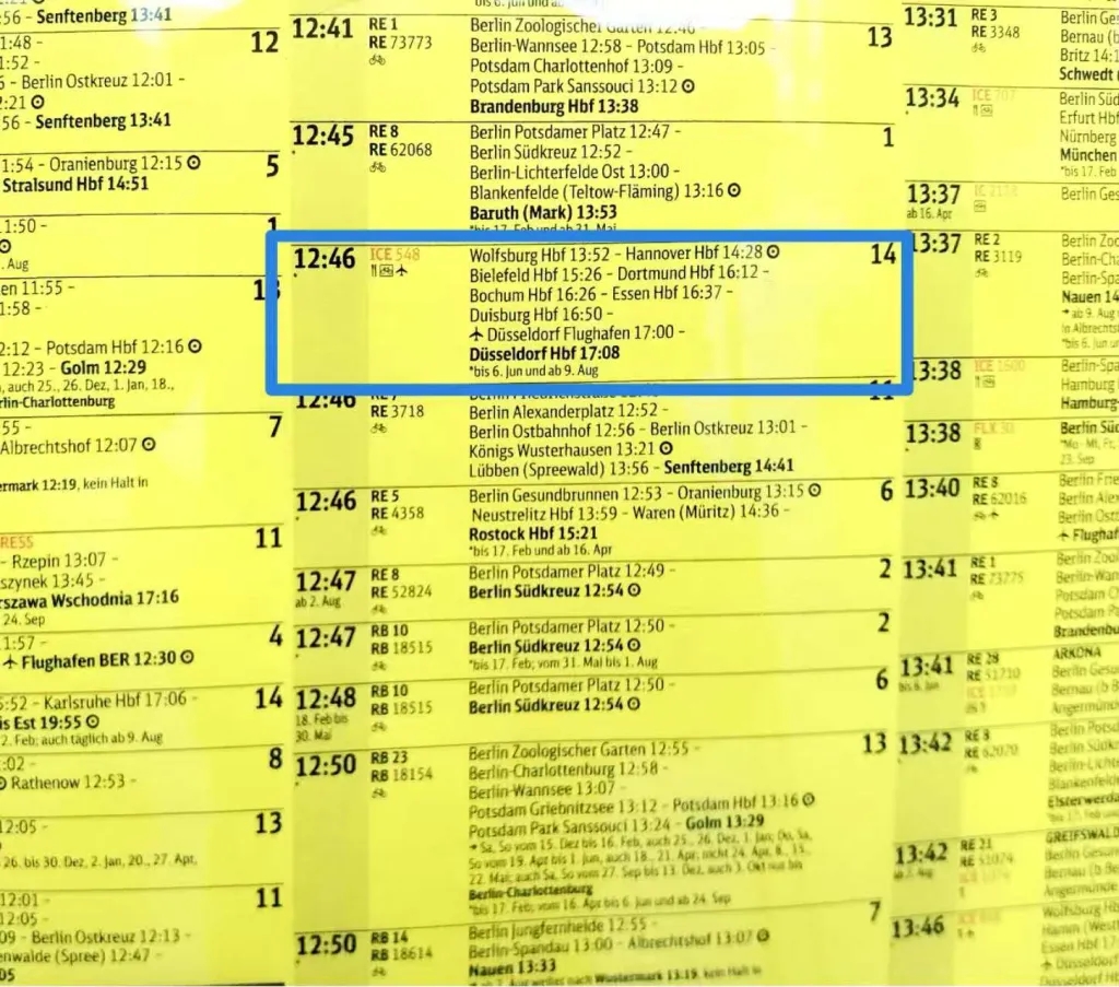 柏林中央火车站张贴的纸质版列车时刻表(蓝框标出的是ICE 548的信息)