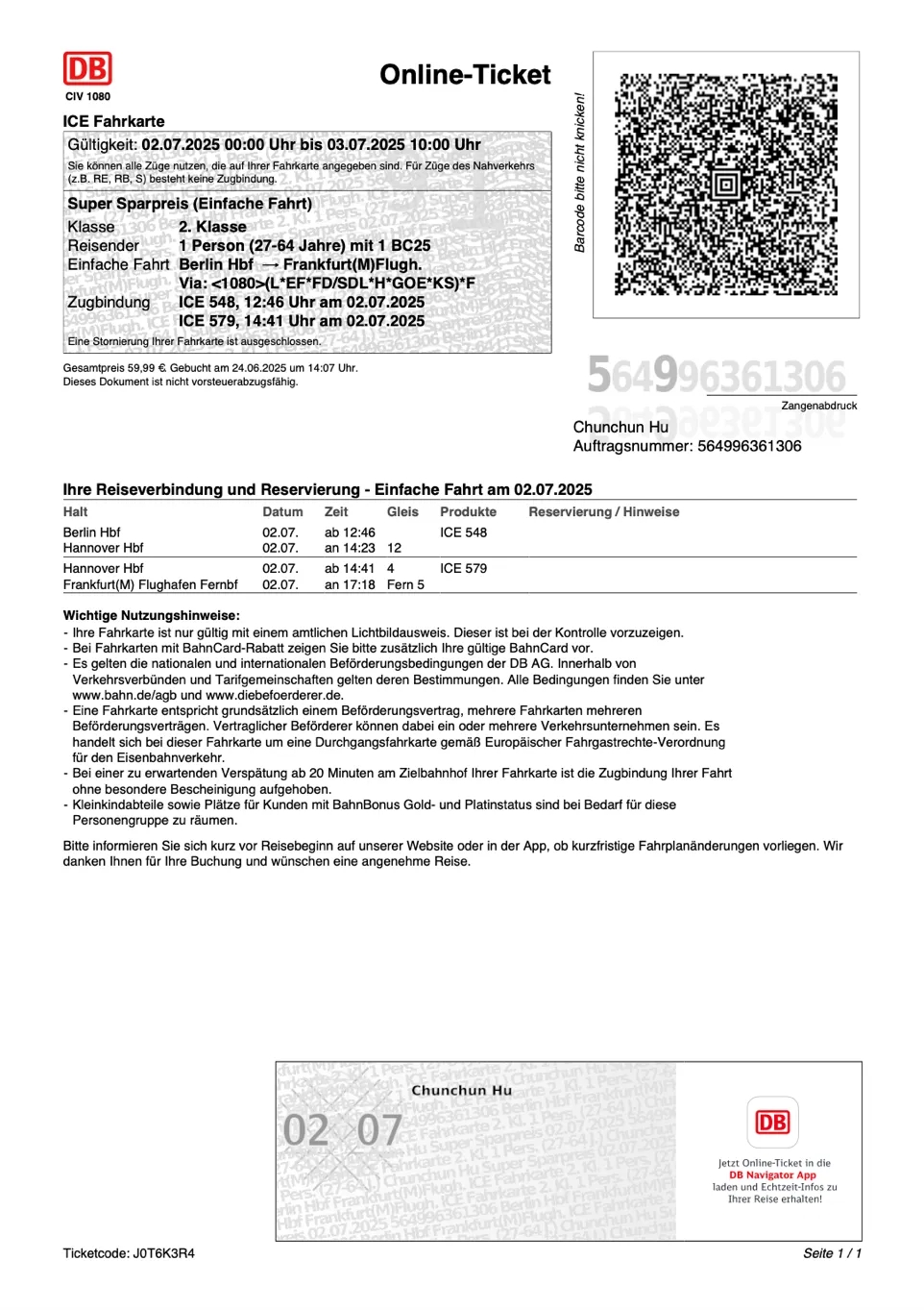具体说来,我预订的ICE 548次是7月2日12点46分从柏林中央火车站发车,计划于14点23分到达汉诺威中央火车站12站台,我有充裕的时间换到4站台,乘坐14点41分的ICE 579次,17点18分抵达法兰克福机场长途列车停靠的5站台。车票打印出来是这样的,既有车次信息,又有二维码供查票用,一切井井有条。