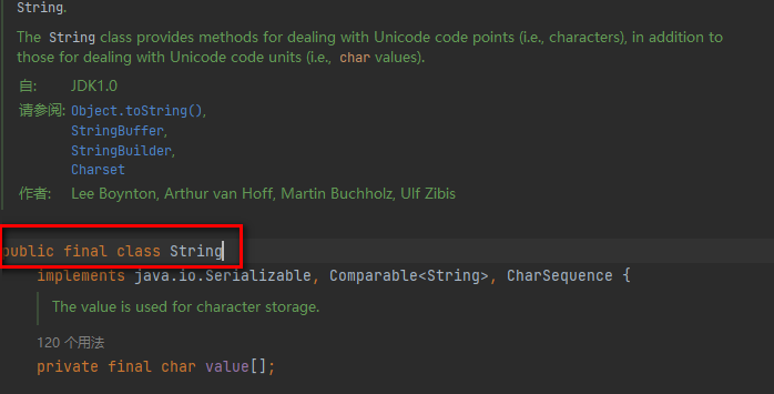 从源码截图中可以看出String 类的声明,从源码里面看String里面实际上是用的一个 char 数组来存储的字符(JDK9+ 已改为 byte数组),
