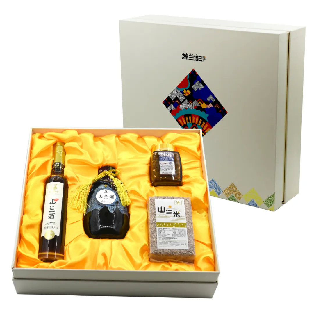 山兰酒礼有2个规格:首席礼盒套装,含首席山兰酒1瓶,230ml山兰酒1瓶,3年窖藏山兰酒原糟200g1瓶;山兰米500g装1瓶;君子礼盒套装,含君子装山兰酒1瓶,230ml山兰酒1瓶,3年窖藏山兰酒原糟200g1瓶;山兰米500g装1瓶