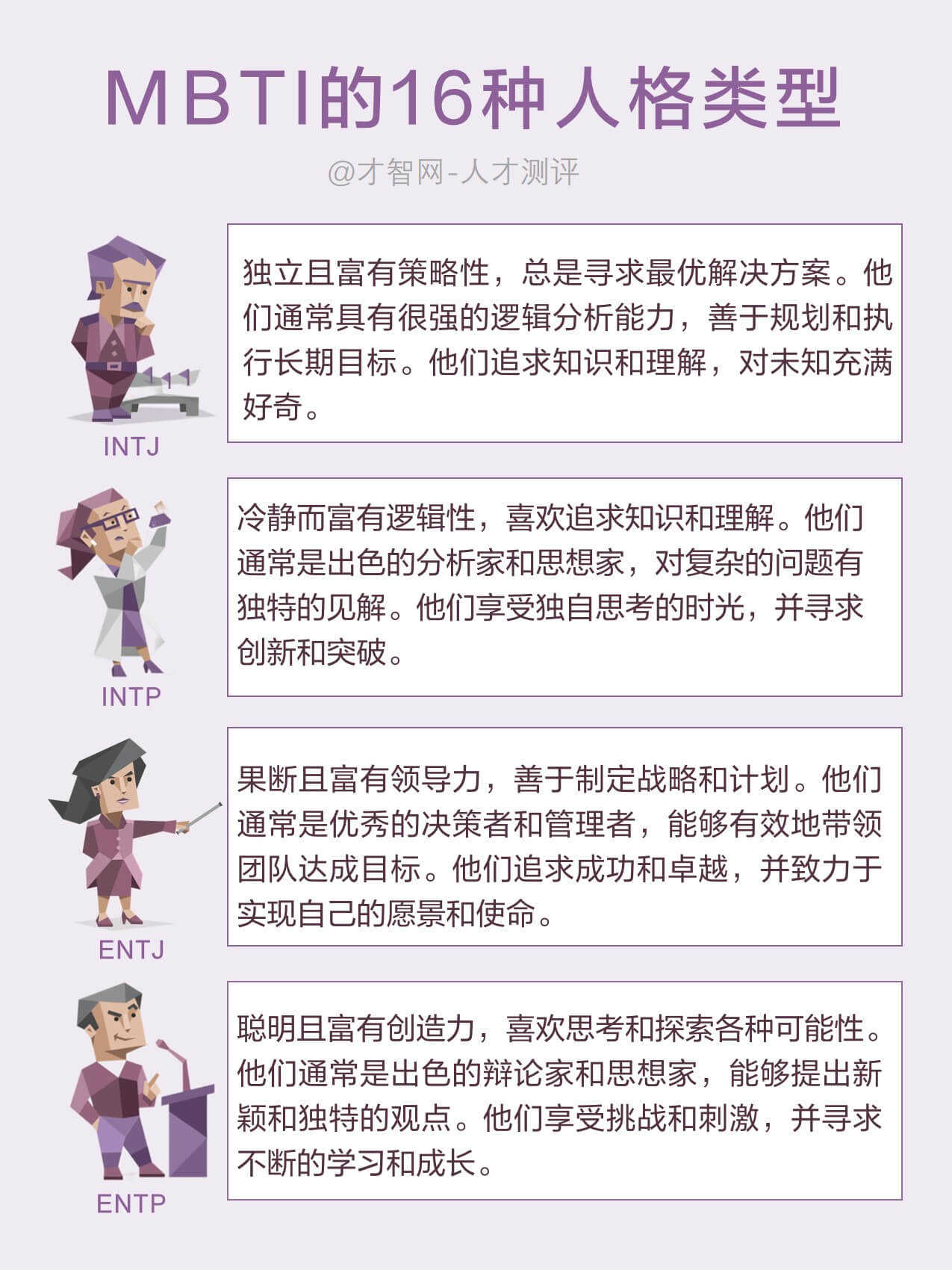 ENTP(辩论家):聪明且富有创造力,喜欢思考和探索各种可能性。他们通常是出色的辩论家和思想家,能够提出新颖和独特的观点。他们享受挑战和刺激,并寻求不断的学习和成长。