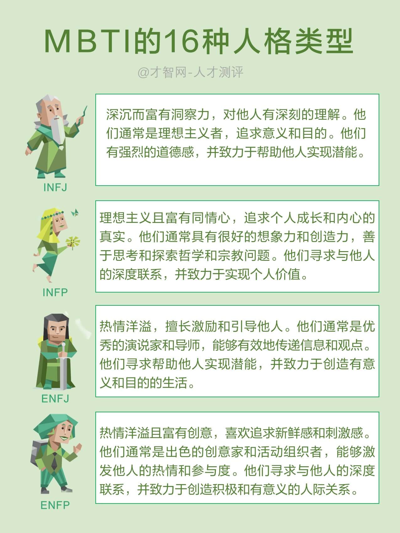 INFJ(博爱者):深沉而富有洞察力,对他人有深刻的理解。他们通常是理想主义者,追求意义和目的。他们有强烈的道德感,并致力于帮助他人实现潜能。