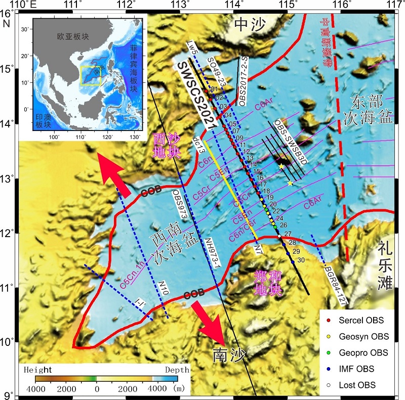 图1 南海西南次海盆的二维主动源OBS深地震探测实验(SWSCS2021)