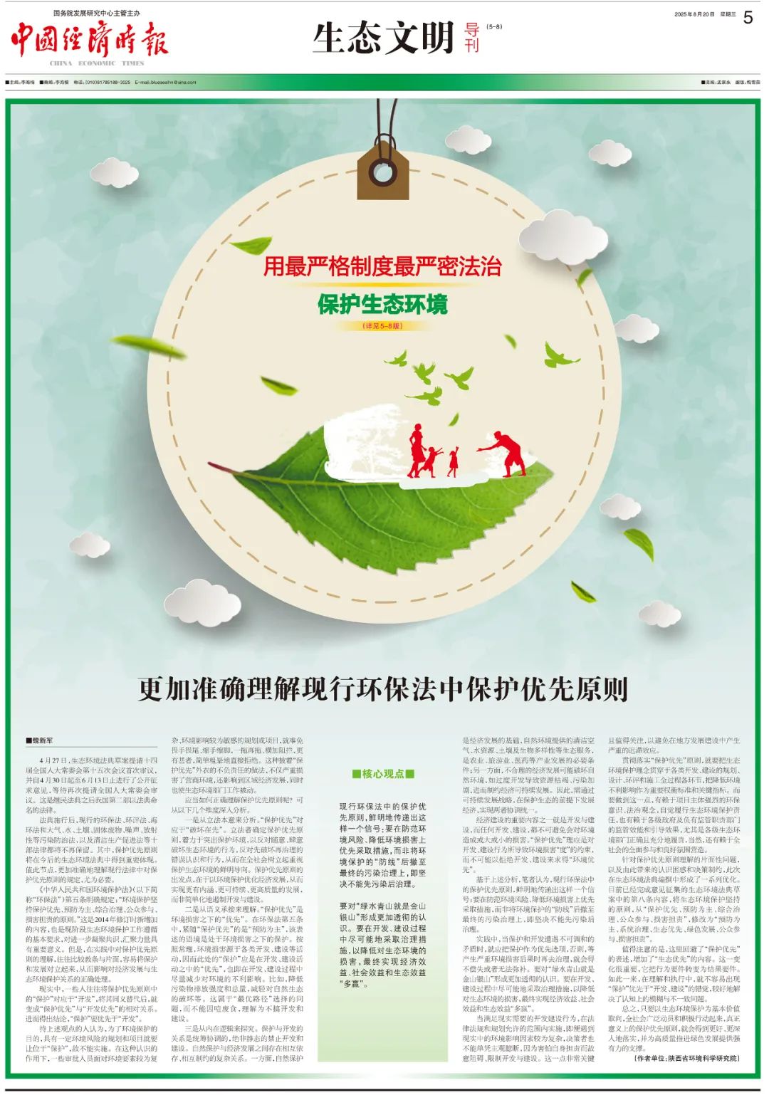 针对保护优先原则理解的片面性问题,以及由此带来的认识困惑和决策制约,此次在生态环境法典编撰中形成了一系列优化。目前已经完成意见征集的生态环境法典草案中的第八条内容,将生态环境保护坚持的原则,从“保护优先、预防为主、综合治理、公众参与、损害担责”,修改为“预防为主、系统治理、生态优先、绿色发展、公众参与、损害担责”。