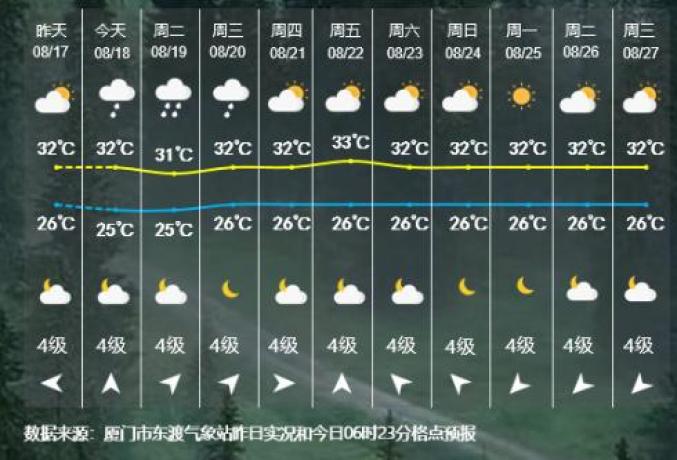 降水:未来十天热带低值系统活跃。受其外围环流影响,18-20日厦门多降水,最强集中在19日白天。降水时局地伴有短时强降水、雷雨大风等强对流天气;其余时段以多云天气为主。