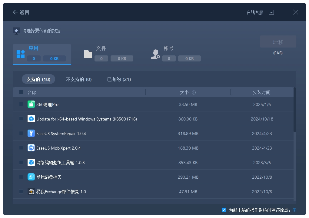 步骤3.易我电脑迁移将开始进行分析并列举出电脑中所有可以传输的应用程序、文件和账号。此过程将花费一些时间,请耐心等待。