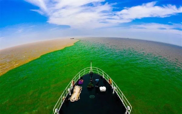 在山东省东营市黄河入海口,黄河与渤海交汇处呈现色彩分明的景观。新华社记者朱峥摄