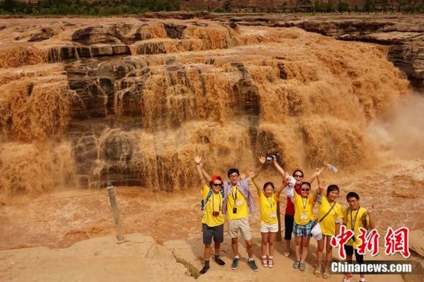 2014年,参加“中国寻根之旅”夏令营的海外华裔师生来到位于陕西省延安市宜川县壶口乡的壶口瀑布参观。中新社发刘尼威摄
