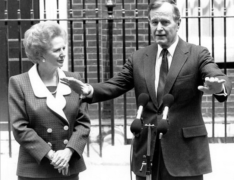1989年,英国首相撒切尔夫人和美国总统老布什在唐宁街10号外