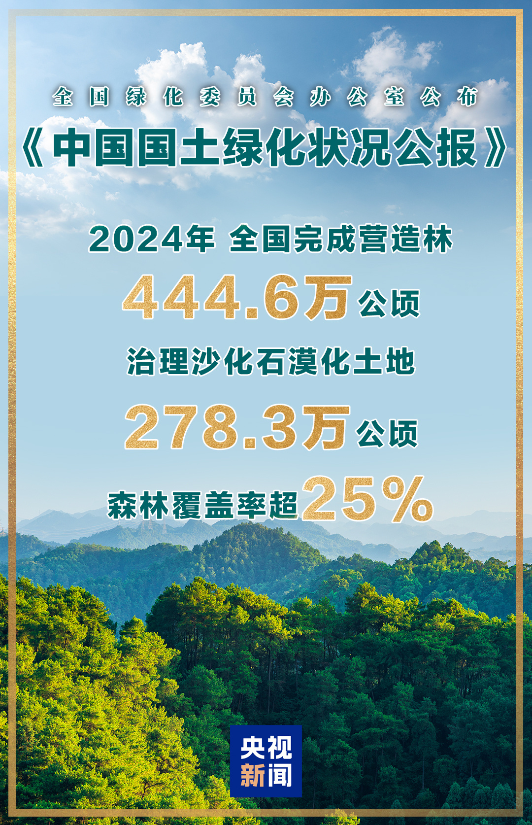 公报显示,2024年,全国完成营造林444.6万公顷,种草改良322.4万公顷,治理沙化石漠化土地278.3万公顷,森林覆盖率超25%,森林蓄积量超200亿立方米。