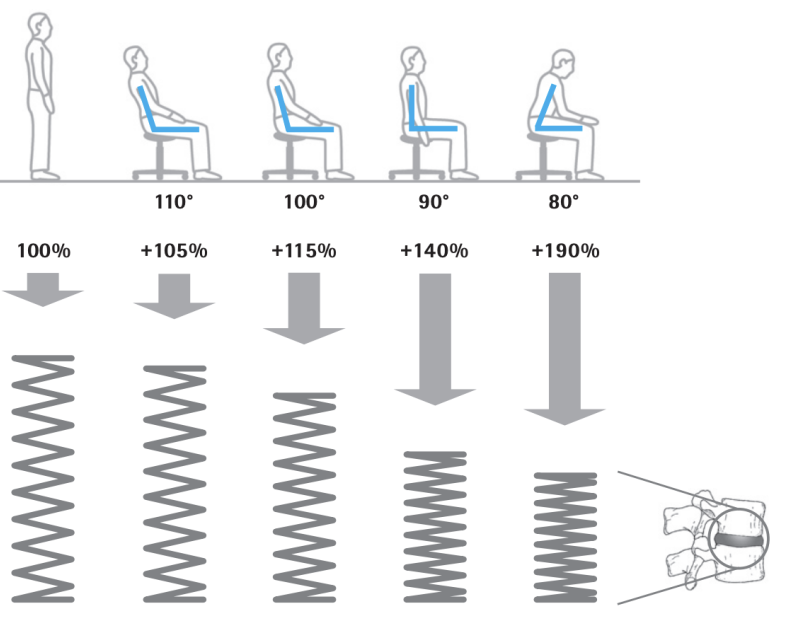 假设正确中立位站立的时候腰部承受的压力为 100%,那么当背部和膝盖成 90 度角坐姿的时候,腰椎的压力达到 140%,比微微后倾的姿势压力要大。而前倾是这几个姿势里压力最大的。