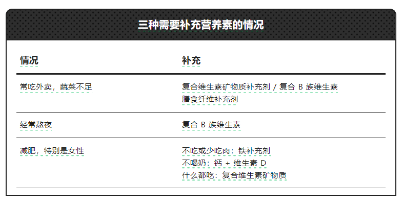 如果无法做到,可能就需要额外补充一些复合维生素矿物质补充剂 / 复合 B 族维生素,膳食纤维补充剂。