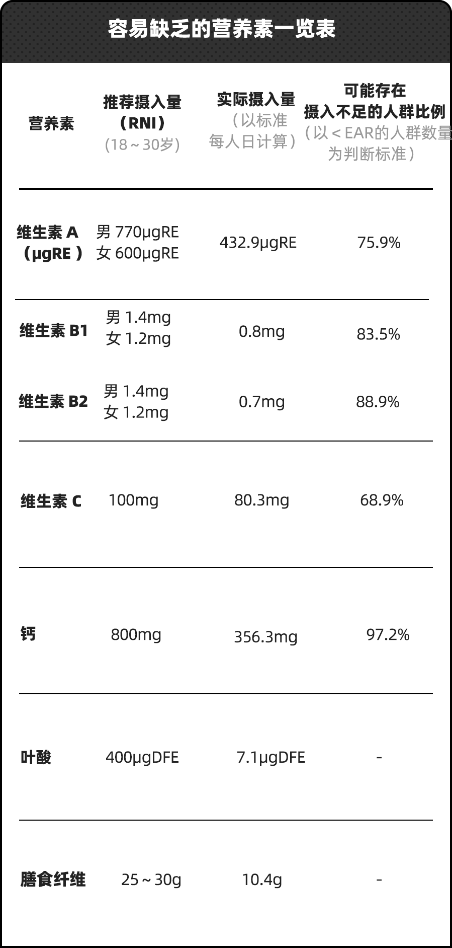根据《2015~2017 年中国居民能量和主要营养素的摄入情况》显示,维生素 A、维生素 B1、维生素 B2,维生素 C、叶酸、钙、膳食纤维是我们容易缺乏的营养素。
