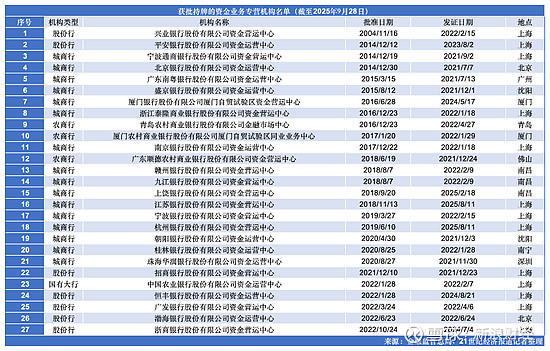 金融监管总局披露数据显示,自2004年首家银行资金营运中心“兴业银行资金营运中心”批准成立以来,截至目前,全国共有27家银行的资金业务专营机构获批独立持牌经营。其中,由中小银行设立的资金业务专营机构达19家,包括16家城商行、3家农商行;股份行中,有兴业银行、平安银行、招商银行、恒丰银行、广发银行、渤海银行和浙商银行获批;国有大行中,仅农业银行获批。