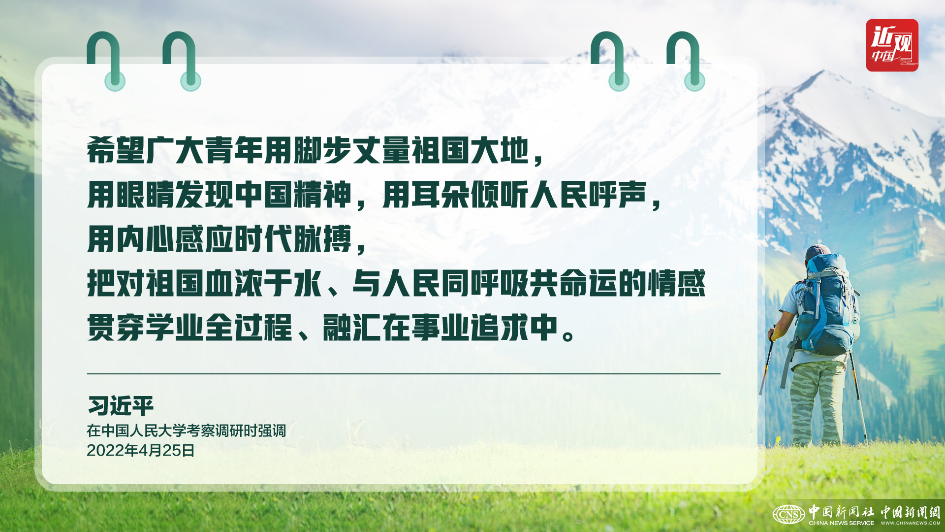 2022年4月25日,在五四青年节即将到来之际,中共中央总书记、国家主席、中央军委主席习近平来到中国人民大学考察调研。习近平代表党中央,向全国各族青年致以节日的祝贺,向中国人民大学全体师生员工、向全国广大教育工作者和青年工作者致以诚挚的问候。习近平希望全国广大青年牢记党的教诲,立志民族复兴,不负韶华,不负时代,不负人民,在青春的赛道上奋力奔跑,争取跑出当代青年的最好成绩!